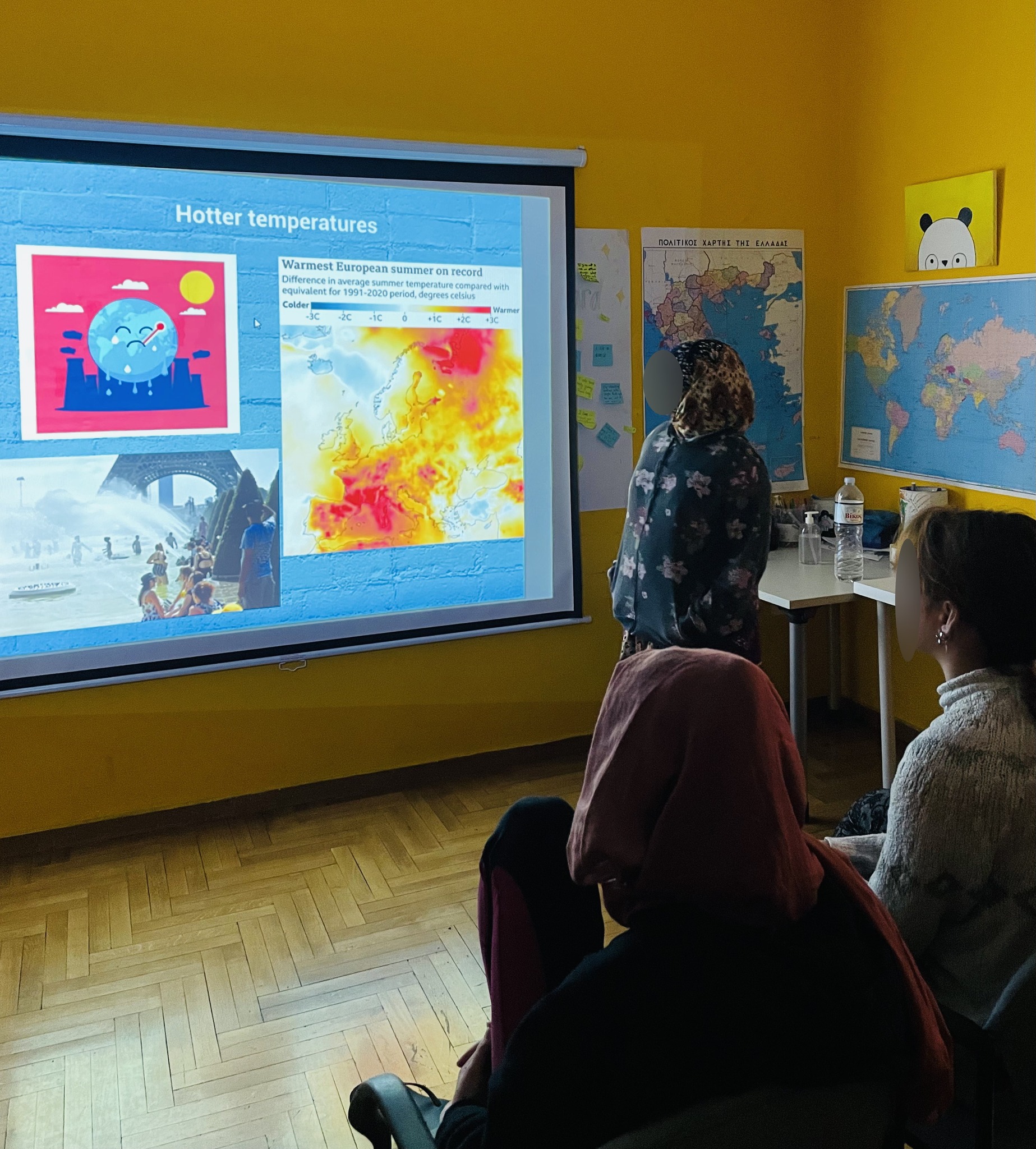 Στο πλαίσιο της ενημέρωσης και ευαισθητοποίησης των ασυνόδευτων ανηλίκων κοριτσιών που φιλοξενούμε στον ΟΙΚΟ, οργανώσαμε εργαστήρια με θέμα "Κλιματική Αλλαγή και Αναγκαστικός Εκτοπισμός". Με απλές λέξεις και κατανοητούς όρους προσπαθήσαμε να αποδώσουμε στο βέλτιστο βαθμό τον ορισμό "Κλιματική αλλαγή". Με τη χρήση οπτικοακουστικών μέσων και τη δημιουργία PowerPoint, τα κορίτσια παρουσίασαν τις αιτίες και τις συνέπειες της κλιματικής αλλαγής καθώς και εναλλακτικές που μπορούν να συμβάλουν στη σταδιακή μείωση - αν όχι εξάλειψη - του φαινομένου.